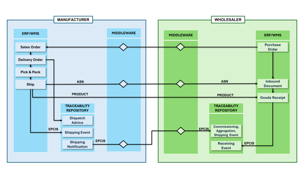 From there, serialized products move from packaging lines to warehouse locations—often across geographies and, in some cases, across national borders, particularly when contract manufacturing organizations are involved or packaging operations span multiple sites. As outbound shipments are prepared, the exact serialized units being shipped are scanned, verified, and associated with shipping containers. Serialization data covering serial numbers, aggregation, locations, and timestamps must be transmitted electronically to the trading partner before, or at least alongside, the physical shipment.