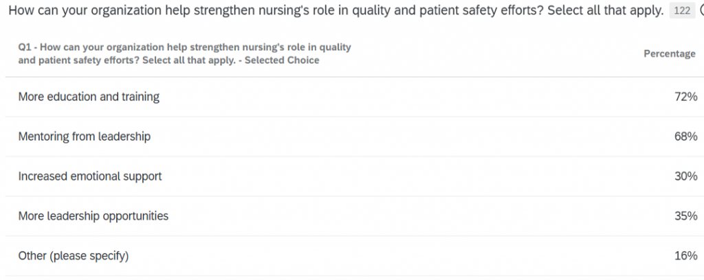 Asked about how their organizations can help strengthen nursing’s role in quality and patient safety efforts, 72% of respondents said more education and training is needed and 68% said mentoring from leadership was necessary. In addition, 35% said more leadership opportunities for nurses would be helpful and 30% called for increased emotional support. Other write-in responses included: