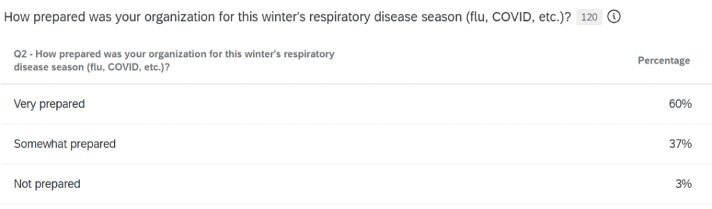 Asked about their organization’s preparedness for this winter’s respiratory disease season, 60% of respondents said they were very prepared while another 37% said they were somewhat prepared. Only 3% said they were not prepared.