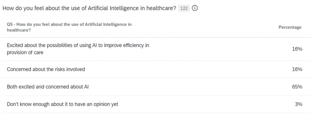 Asked about their feelings on the use of artificial intelligence (AI), 65% of respondents said they were both excited and concerned about AI, 16% were concerned about the risks involved, 16% were excited about the possibilities of using AI to improve efficiency in provision of care, and 3% said they didn’t know enough about AI to have an opinion yet.