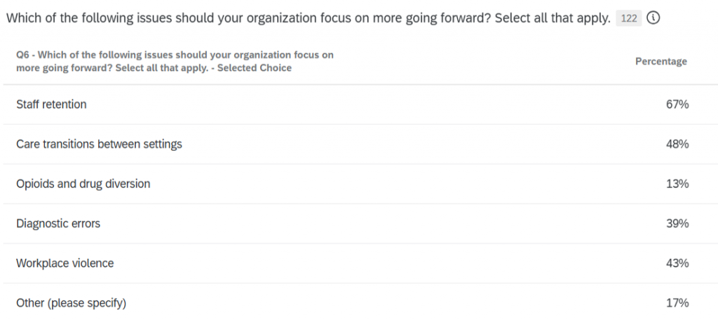 Asked which issues their organization needed to focus on more, 67% of respondents said staff retention, 48% said care transitions between settings, 43% said workplace violence, 39% said diagnostic errors, and 13% said opioids and drug diversion. Write-in responses included: